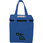 The Cube 9-Can Non-Woven Lunch Cooler is insulated with a heat-sealed water-resistant lining. It features a zippered main compartment, an open front pocket, a clear ID window and a dual carry handle.