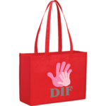 The Evermore Non-Woven Shopper Tote has a large open main compartment with double 28 inch reinforced handles. It's reusable and nevermore will need to rely on plastic bags. Gusset & Handle Decorating does not qualify for one day turn. Polypropylene is recyclable with #5 plastics please check with your local municipalities for specific rules and regulations.
