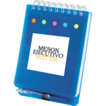The Memo Flag Spiral Jotter includes a matching mini-ballpoint pen with black ink, five assorted color sticky flags, a 2" x 3" sticky memo pad and 80 ruled pages. A pen imprint not available.