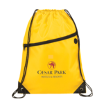 The Robin Drawstring Bag has a large main compartment with a cinching rope closure. The zippered front pocket also features an earbud port and reinforced corner tabs.