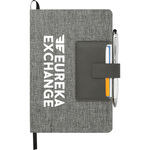 The 5.5" x 8.5" Heathered Executive Bound Notebook features a heathered fabric cover with PU card pocket made for storing business cards. Magnetic strap closure. 80 sheets of white lined paper. Black ribbon page marker. Black elastic pen loop.