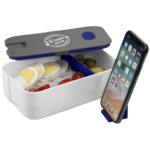 Bento style food storage 2 compartment container with added phone stand. FDA compliant. BPA free. Microwave safe.